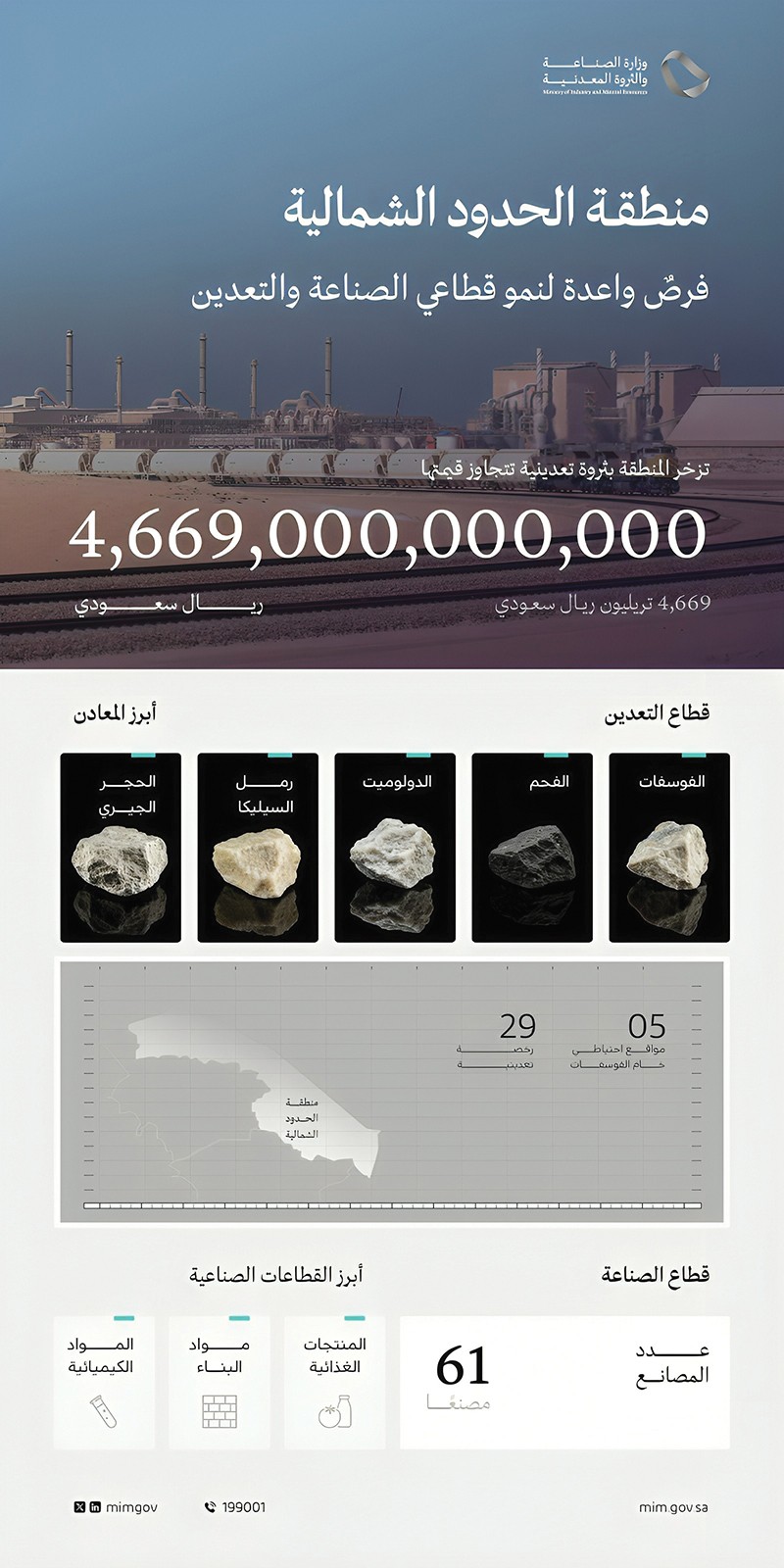ويُعد مشروع وعد الشمال من أبرز النماذج التنموية، إذ يمتد على مساحة 440 كم² ويحتضن واحدة من أكبر منشآت الفوسفات في العالم، بما يشمل مصانع للأمونيا، وحامضي الفسفوريك والكبريتيك، ومرافق لوجستية متكاملة تدعم عمليات النقل والتصدير عبر قطار التعدين إلى ميناء رأس الخير على الخليج العربي.