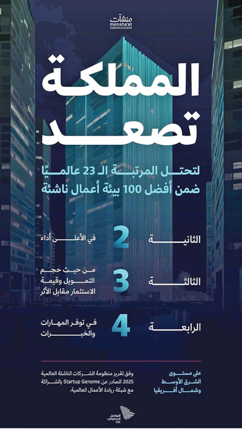 المملكة تقفز إلى المركز 23 عالميًا كأفضل بيئة حاضنة للشركات الناشئة في عام 2025م، وقد تزامن هذا الصعود مع نمو سوق التقنية ليصل إلى 180 مليار ريال.