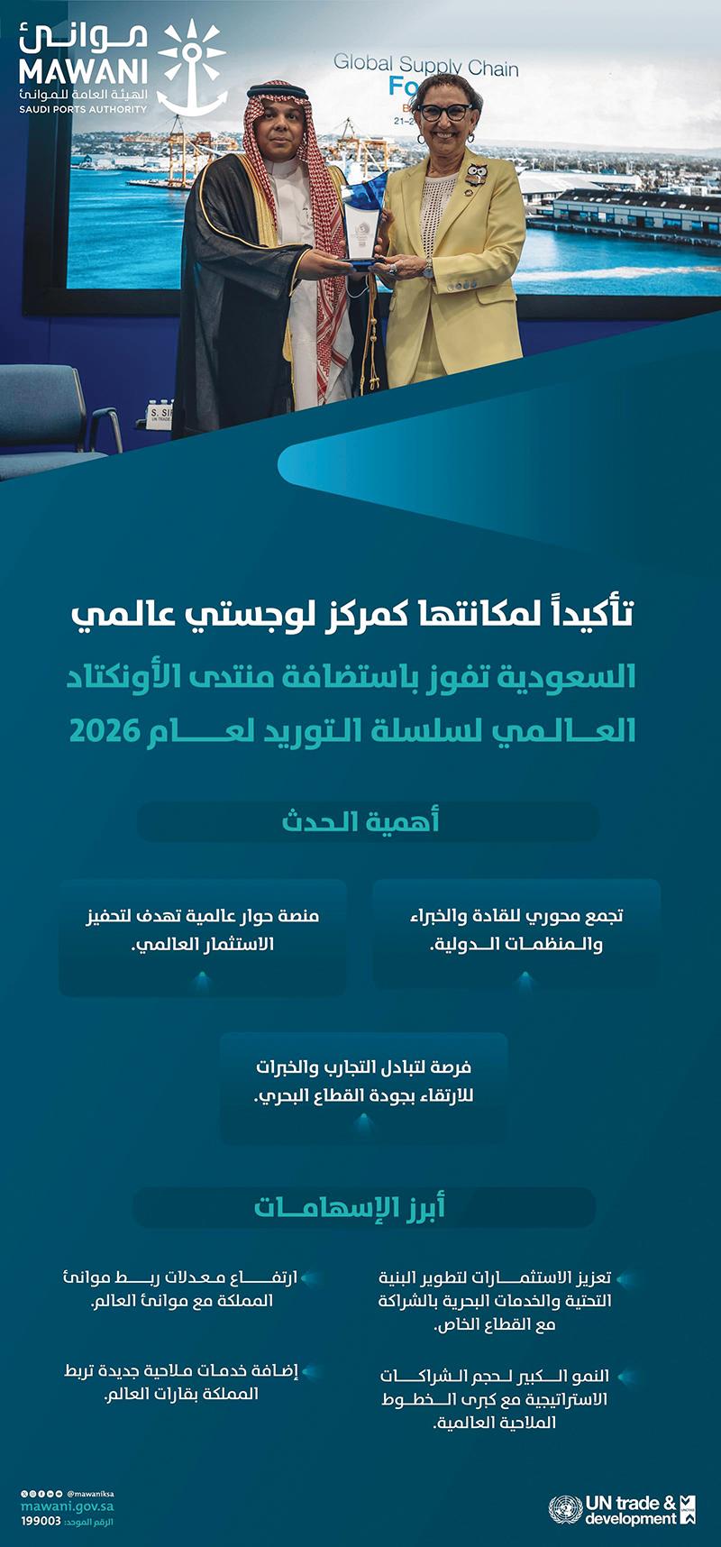 وتعزز المملكة هذه المكانة عبر مسارات استراتيجية متعددة، من بينها استضافة فعاليات ومنتديات دولية كبرى، مثل: منتدى “الأونكتاد العالمي لسلاسل التوريد”، المقرر عقده في أواخر العام الجاري، ويستهدف صياغة رؤى مستقبل التجارة العالمية وتعزيز مرونة سلاسل الإمداد في مواجهة الاضطرابات الجيوسياسية والمناخية، ما يعزز – بلا شك- اعترافًا دوليًا متناميًا بريادة المملكة في هذا القطاع وتحوُّلها إلى وجهة رئيسة لصناع القرار في التجارة الدولية.