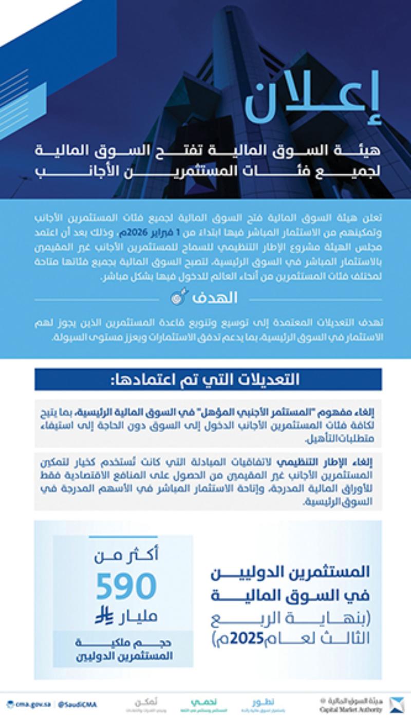 فقد قررت هيئة السوق المالية، في 1 فبراير 2026م، فتح أبواب سوق الأسهم (تداول) أمام جميع فئات المستثمرين الأجانب للاستثمار المباشر في الأسهم المدرجة، وذلك بعد تعديل الإطار التنظيمي وإلغاء نظام المستثمر الأجنبي المؤهل (QFI) الذي كان يشترط شروطًا خاصة قبل الدخول في السوق، وبهذا التعديل، يمكن للأفراد والمؤسسات الأجنبية دخول السوق وشراء الأسهم مباشرةً عبر الوسطاء المرخصين في المملكة دون الحاجة إلى متطلبات القيد السابقة، كما تم إلغاء نظام اتفاقيات المبادلة الذي كان يمنح مجرد تعرض اقتصادي بدلاً من ملكية فعلية، وذلك بهدف توسيع قاعدة المستثمرين وزيادة السيولة وتعزيز التدفقات الاستثمارية العالمية إلى السوق المحلية..